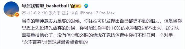 难怪辽宁媒体人导演我躺哪就就忍不住了,一针见血指出了辽宁男篮的症结。他是这样说的:“当你的精神意志力足够的时候,你往往可以发挥出自己都想不到的潜力,但是当你思想上先投降先放弃的时候,你可能连你平时10%的水平都发挥不出来,辽宁队需要重拾信心了,没有信心和必胜的信念在竞技体育中你打不过任何一个对手,‘永不言弃’才是球迷最希望看到的。”